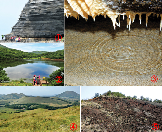 ▲① 응회퇴적층으로 이루어진 수월봉. ② 사라오름 하부는 불투수성 지질로 되어있다. ③ 용암동굴중 하나인 용천동굴. ④ 도내 오름 대부분은 스코리아구로 이루어졌다. ⑤ 송이층(스코리아)이 훼손되고 있는 도너리오름.