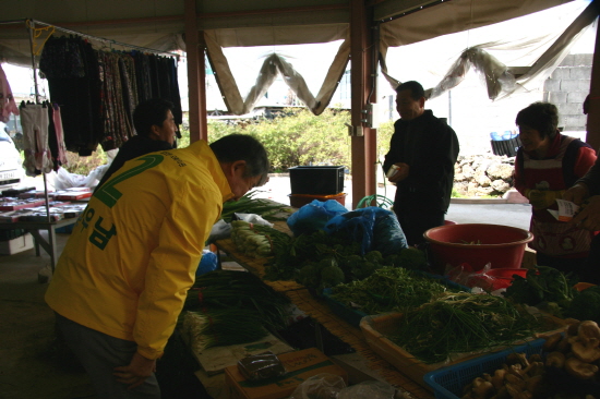 6일 오전 함덕 오일장에서 상인들과 만나며 지지를 당부하고 있는 민주통합당 김우남(사진 왼쪽) 후보.