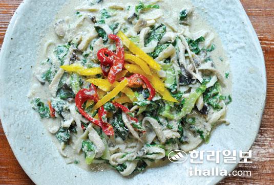 ▲들깨스파게티. 버섯볶음국수를 응용해 만든 음식으로 담백한 맛이 별미다.