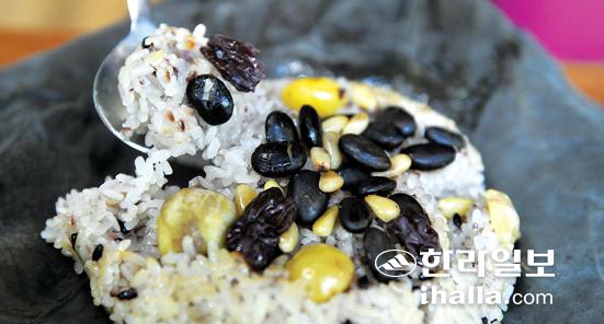 연잎을 펼치자 연잎 특유의 은은한 향이 밴 찰진 밥맛이 평소 먹던 밥과는 확 다르다. 연잎 자체가 몸안의 노폐물 제거 효과가 있고 잡곡, 견과류 등이 들어갔으니 영양면에서도 두말 할 필요가 없다.