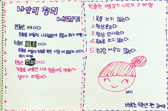 친절은 '봉사활동'이다. 왜냐하면 어떤 봉사활동이든지간에 친절한 마음이 기본이기 때문이다. 친절은 '변화'이다. 왜냐하면 친절은 다른 사람의 마음을 변화시키기 때문이다(백록초 5학년 김예린)이라고 썼다.