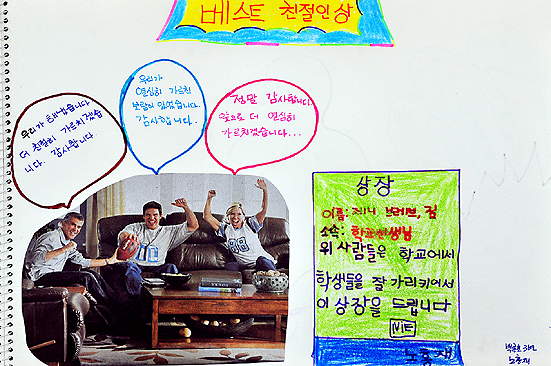 친절한 마음, 말씨, 미소 등을 골고루 갖춘 사진을 찾아 상을 주기로 하고 찾아보게 했다. 주고 싶은 이유를 적게 하고 상을 받은 사람의 소감도 쓰게 했다.