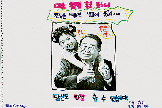 '친절을 베풀면 꽃향기가 납니다. 당신도 꽃이 될 수 있습니다(백록초 5학년 김예린)', 친절은 기쁜 마음에서 시작됩니다. 내 미소는 당신의 행복입니다(백록초 5학년 노혁재)', '친절을 베풀면 얼굴에 웃음이… 당신도 친절할 수 있습니다(백록초 3학년 노홍재)'라고 표현했다.