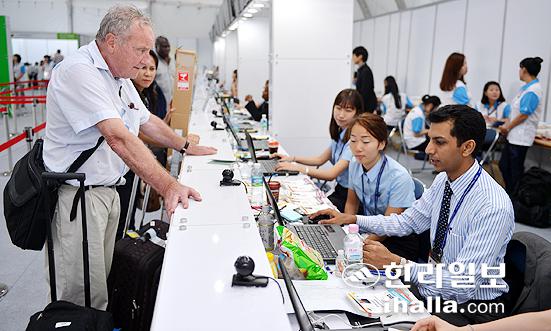 ▲2012세계자연보전총회 개막을 하루 앞둔 5일 제주국제컨벤션센터를 찾은 외국인들이 참가자 등록을 하고 있다. /사진=강희만기자