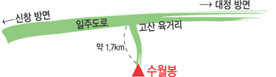 수월봉. 제주시 서쪽 가장자리에 위치한 높이 77m의 야트막한 언덕 형태의 오름이다. 탁트인 바다와 접해 있는 오름은 인근에 당산봉, 그리고 해안에서 1㎞ 남짓 떨어져 여러 개의 오름으로 이뤄진 섬 차귀도를 배경으로 자리잡고 있다.