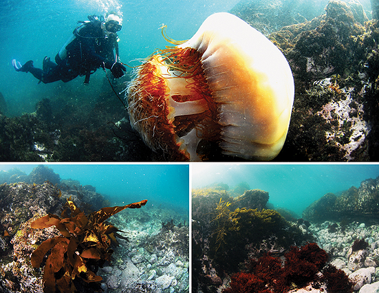 ▲육상양식장의 배출수가 유입되지 않는 행원리 육상양식단지 동쪽 조하대에는 감태와 톳 등 다양한 해조류가 서식하고 있다. 사진 위는 수중탐사 중 만난 노무라입깃해파리. /사진=조성익 자문위원(수중촬영전문가)