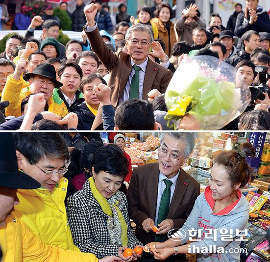 ▲지난 7일 대선후보 등록 이후 처음으로 제주를 방문한 문재인 후보는 제주시 동문로터리 산지천 광장에서 지지 호소 연설(위)과 동문시장 거리 유세를 통해 제주도민 표심잡기에 나섰다. 강희만기자 photo@ihalla.com
