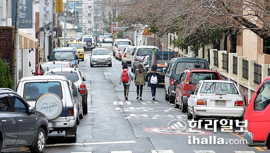 ▲주차관리 종합계획 용역을 수행중인 연구진이 주차난 완화대책으로 제시한 동광초등학교 인근 주택가 주차환경개선지구 시범지정 대상 지역이다. 강경민기자 photo6n6@ihalla.com