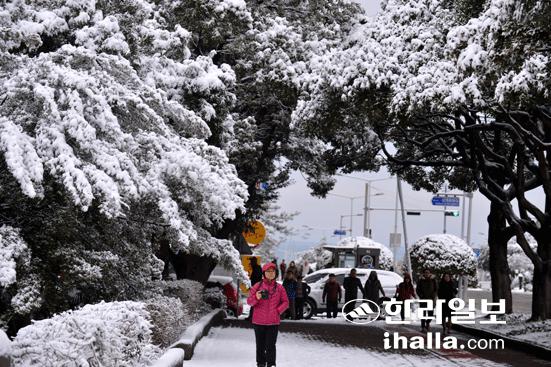 제주지방기상청에 따르면 이 날 오전 9시 현재 제주시 아라동에 14㎝의 눈이 내린 것을 비롯해 유수암에 13㎝의 적설량을 기록했다. 한라산 윗세오름에 17㎝, 관음사에 10㎝의 눈이 내렸고, 제주시 해안지역에도 2.5㎝의 눈이 내려 도로와 나뭇가지마다 하얀 눈이 수북하게 쌓였다.