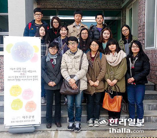 ▲'필링힐링'회원으로 활동하는 제주대 학생들이 지난 2일 봉사를 끝낸 뒤 제주정신요양원 건물 앞에서 기념촬영했다. 진선희기자