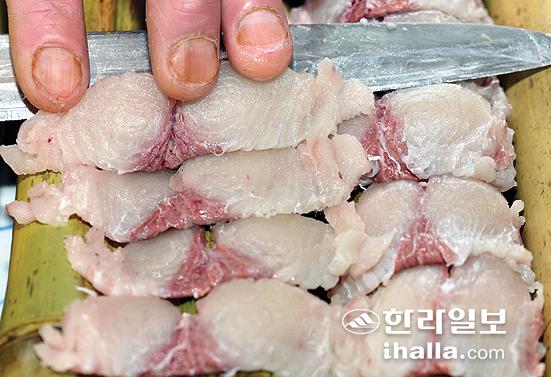 ▲냉장고에서 2~3일 숙성시켜 부드럽고 고소한 삼치회. 강경민기자