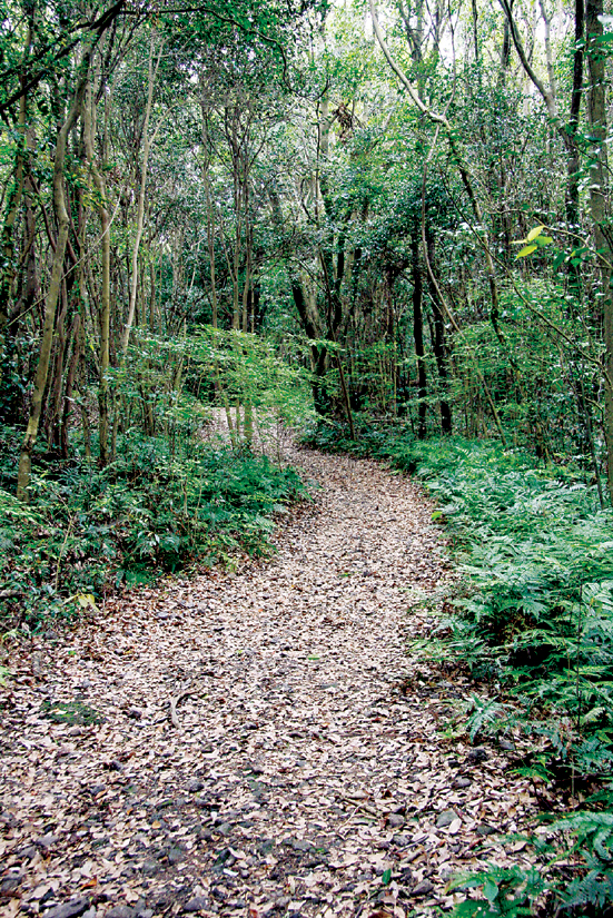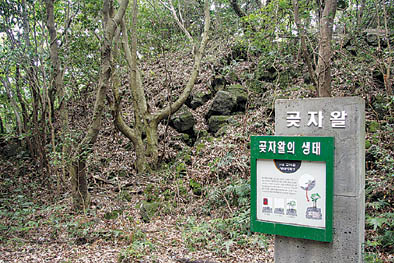 먼물깍을 벗어나면 다시 울창한 상록활엽수림이다. 덕분에 제법 따가운 초여름 햇살을 잠시 잊게 한다. 나무사이로 간간이 스며드는 햇살을 만나고서야 바깥날씨가 떠오를 정도다. 선흘곶자왈을 대표하는 늘푸른 나무인 종가시나무와 참가시나무, 구실잣밤나무 사이로 난 탐방로 바닥에는 낙엽이 가득해 발 밑에서 바스락거린다. 머리위에서는 나무들이 바람결에 몸을 맡긴 채 "솨~솨~" 하고 소리를 낸다.