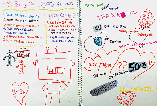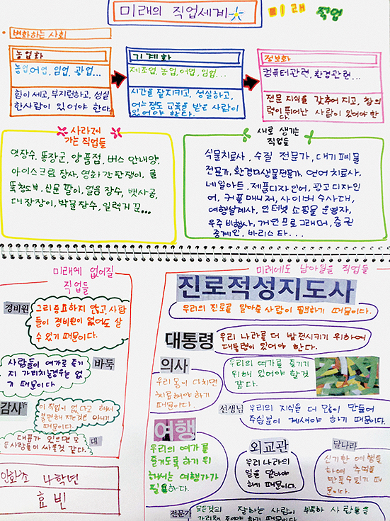 과거에서 현재 그리고 미래까지 변화될 사회모습과 각각의 시대에 맞는 직업, 그 직업이 주를 이뤘던 이유 등에 대해 생각하고 사라져가는 직업과 새로 생길 직업들에 대한 내용을 정리해보면서 미래사회의 변화되는 직업세계를 스스로 알게 했다. 이런 활동을 통해 자신이 어떤 직업에 관심이 있고 미래 사회의 직업에서 요구하는 능력이 무엇인지 이해하여 앞으로의 진로를 준비하고 계획하는데 도움이 될 수 있었다.