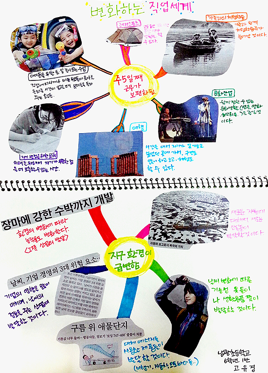 1. 미래사회의 변화를 느낄 수 있는 것들을 신문에서 찾고 책과 신문을 이용해 다양한 직업을 찾고 어떤 일을 하는지 정리했다.
