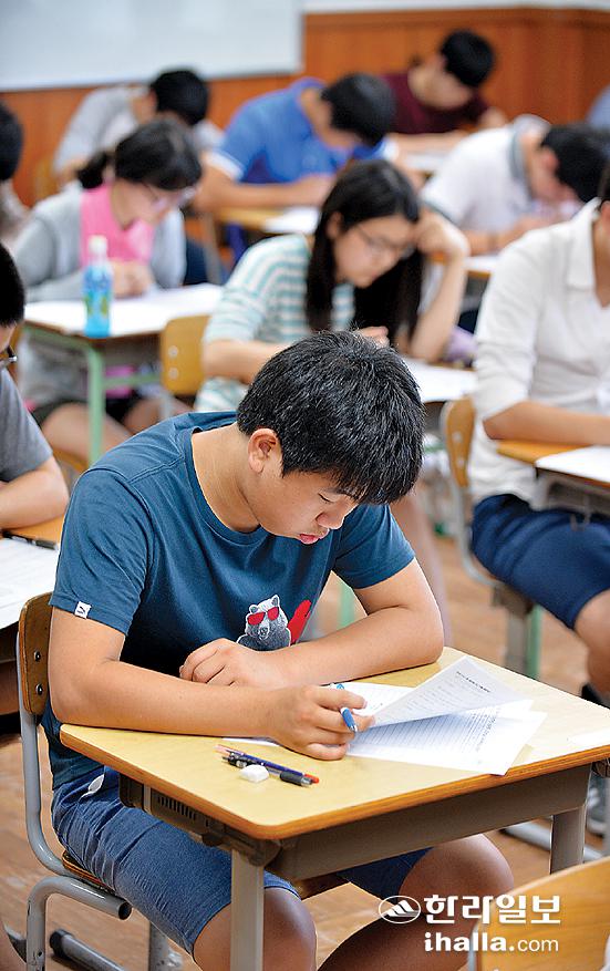 ▲수시모집으로 대학에 진학한 이들은 꾸준한 논제 파악과 모범답안의 정돈된 문체 익히기, 끈기와 인내로 논술을 준비했다고 수능을 준비하는 후배들에게 조언했다. 사진은 올해 7월 13일 제주제일고에서 열린 JDC 논술대회. 사진=한라일보 DB