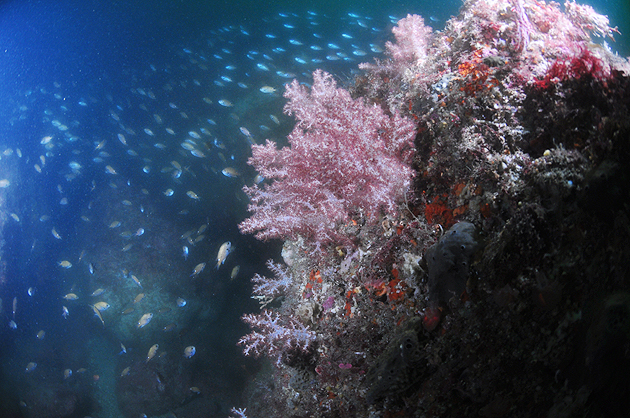 수중여 상부, 감태숲 등 다양한 연산호 서식다른 다이빙 포인트 비해 자연 상태 그대로자리돔 군무, 문섬·범섬 비교해도 손색 없어