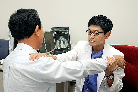 ▲어깨가 아프고 팔을 들어올리기 힘들다면 한번쯤은 회전근개가 파열된게 아닌가 하고 의심을 갖고 병원을 찾아야 한다. 제주대학교병원 정형외과 최성욱 교수가 어깨질환 환자의 증상을 살피고 있다.