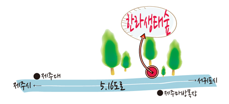 한라생태숲은 제주시에서 5·16도로를 타고 서귀포 방향으로 가다 보면 제주CC를 곧 지나서 만날 수 있는 숲이다. 시내에서 불과 10~20분이면 닿을 수 있는 숲이 있다는 건 제주사람들이 누릴 수 있는 즐거움 가운데 하나가 아닐까 싶다. 2009년 9월 개장한 196㏊의 광활한 생태숲은 초지를 조성해 목장으로 사용되던 공간을 자연생태계 복원기법으로 복원했는데, 2000년 착공후 10년만에 그 모습을 드러냈다.