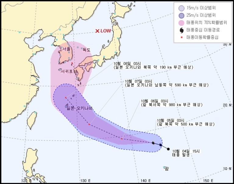 한편 태풍 피토는 4일 오후 3시 일본 오키나와 남남동쪽 약 450㎞ 부근 해상을 지나고 있는데, 7일 오후엔 중국 상하이 남남서쪽 약 240㎞ 부근 육상에 진출할 것으로 기상청은 예상했다.