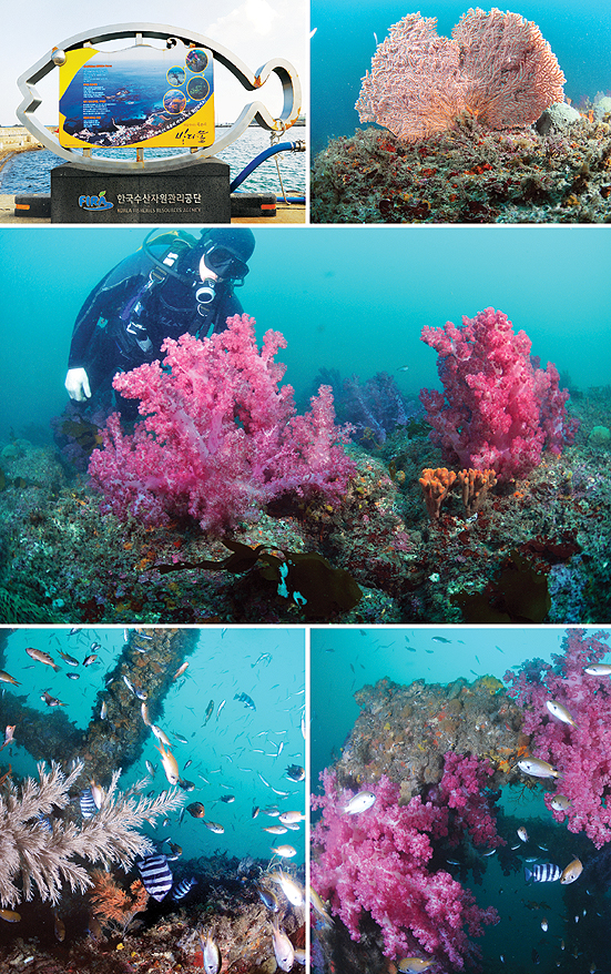 수심 20m 정도에 위치한 인공어초 어장에는 사각어초가 3층으로 쌓여져 있었고 자연암반의 연산호 군락에 뒤지지 않는 다양한 연산호 군락과 돌돔, 볼락, 조피볼락, 전갱이 등의 다양한 어류가 어초의 내부와 상부에서 유영하고 있는 모습에 또한번 감탄을 하지 않을 수 없었다.