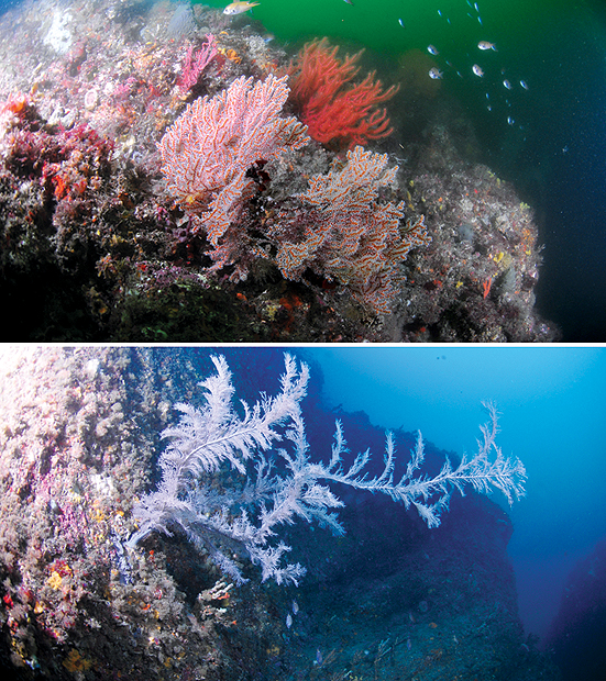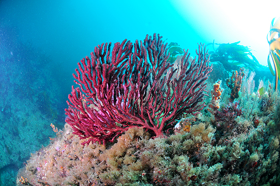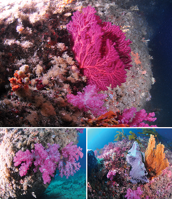 ▲'검멀네'라 불리는 우도의 동굴 포인트에선 감태를 비롯 참곱슬이와 같은 다양한 홍조류와 더불어 분홍바다맨드라미, 가시수지맨드라미, 큰수지맨드라미, 가시산호류, 총산호류, 해송 그리고 굵은나선별해면 등 다양한 생물이 서식하고 있는 모습을 관찰할 수 있다.