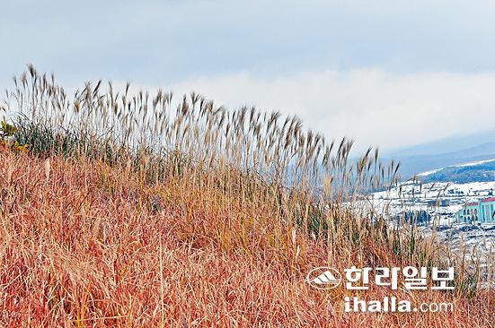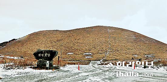 가을이 저물고 겨울 문턱으로 막 접어드는 지난 주말 애월읍 봉성리에 있는 새별오름을 찾아나섰다. 서둘러 찾아온 강추위가 제법 매서운 날이었는데 제주시 신제주로터리에서 평화로로 접어들면서 간간이 눈발까지 날리기 시작했다. '오름을 오르려면 고생 꾀나 하겠다' 걱정하며 20분쯤 달려 도착한 오름은 하얀 눈을 뒤집어쓴 주변 경치와 함께 황홀경을 연출하고 있었다. 순간 걱정은 저만치 달아나고, 정상에선 또 어떤 비경을 펼쳐보일지 설레는 마음이 앞선다.