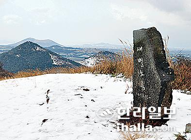 흐린 날씨지만 오름 정상은 제주의 겨울을 한눈에 품을 수 있는 최고의 전망대다. 눈이 살짝 내려앉은 이웃한 수많은 오름들이 사방으로 펼쳐진다. 남쪽으로는 길게 뻗은 평화로와 바리메오름·괴오름이, 그리고 멀리 동쪽으로 한라산 정상이 희미하게 들어온다. 북쪽으로는 섬 비양도와 바다가 보인다.