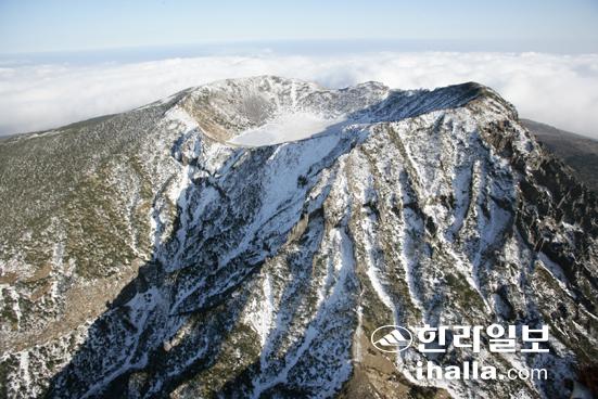 ▲제주가 세계환경수도로 인정받을 경우 제주발전을 선도하는 신성장 동력산업 육성과 세계인이 인정하는 환경보물섬의 실질적 가치와 브랜드 가치를 활용한 산업이 성장할 것으로 예상되고 있다. 사진은 항공 촬영한 겨울철 한라산. 사진=한라일보 DB