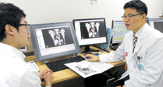 ▲제주대학교병원 방사선종양학과 김영석 교수(오른쪽)가 동시 항암 약물 방사선 치료예정인 폐암 환자의 방사선 치료 계획을 평가하고 있다.