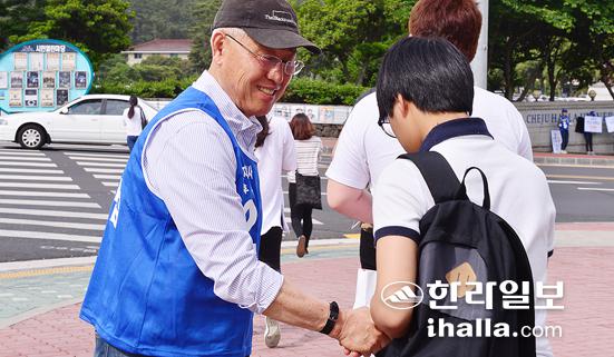 새정치민주연합 신구범 후보가 27일 제주한라대학교 정문에서 등교하는 대학생들과 일일이 악수를 나누며 표심공략에 나섰다. 강희만기자