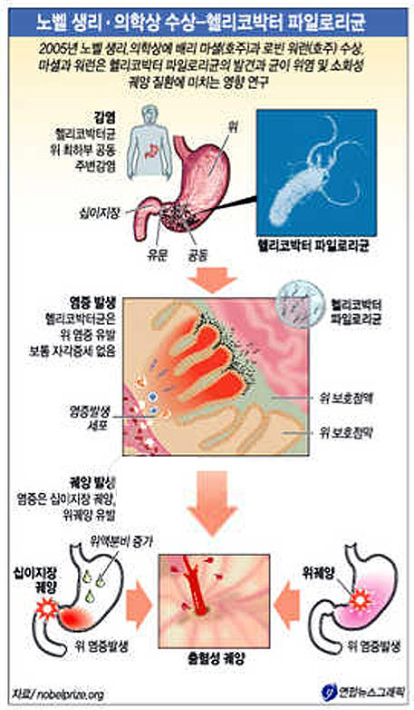 헬리코박터균은 100년도 더 전에 독일의 과학자들이 처음 발견했으나 그들은 균을 따로 분리해서 증명해 내지는 못했고 기억 속에서 잊혀 지게 된다. 이후 호주 태생인 베리 마셜 박사가 1982년에 다시 발견하게 되고 이듬해 우연히 균을 분리해 증명하는데 성공하게 된다. 당시에만 해도 의사들은 위궤양이나 십이지장궤양이 위장에 해로운 음식물을 먹음으로써 발생한다고 생각했다. 현재 위궤양과 헬리코박터균과의 상관관계는 의학계의 정설이 됐으며, 1994년에 헬리코박터균은 세계보건기구 산하 국제암연구소가 규정한 1등급 발암물질이 됐다. 베리 마셜 박사는 이러한 공로를 인정받아 2005년 노벨 생리의학상을 수상하게 된다.