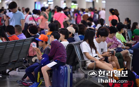 ▲태풍 '너구리'가 북상하면서 제주지역에 강한 비바람이 불고 있는 가운데 9일 오전 제주국제공항 항공편 일부 노선이 지연되면서 탑승객들이 대기하고 있다. 강희만기자