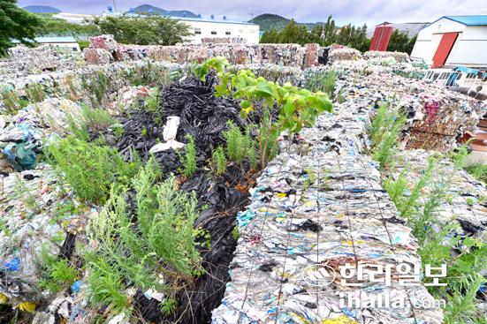 지난 2012년 4월부터 이달 현재까지 제주시 리사이클링센터에서 선별과정을 통해 A사에 공급한 폐필름류는 약 1000톤. 수년동안 재활용 처리가 이뤄지지 않으면서 야적장에 적치된 필름류 주변에는 잡초만 무성하게 자라고 있는 실정이다. 강희만기자