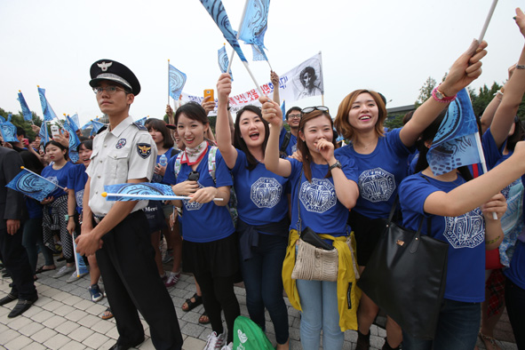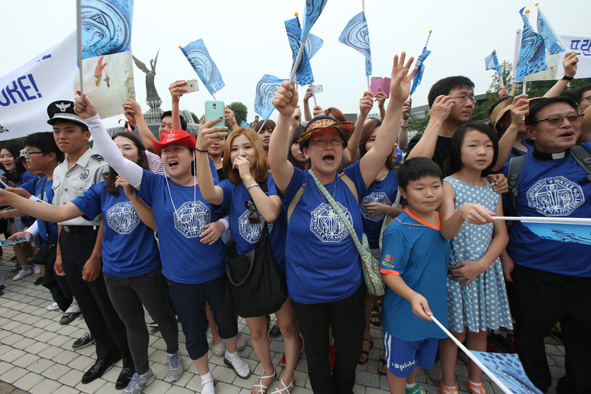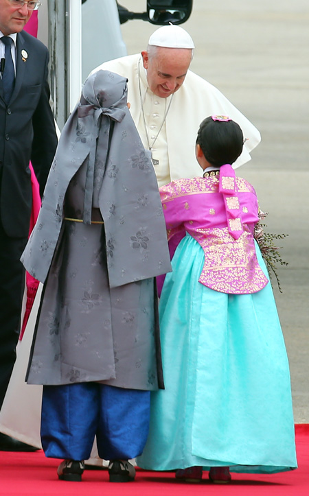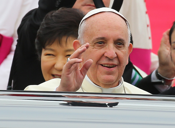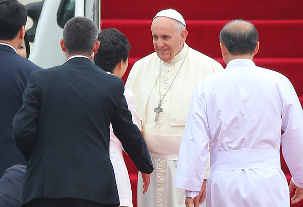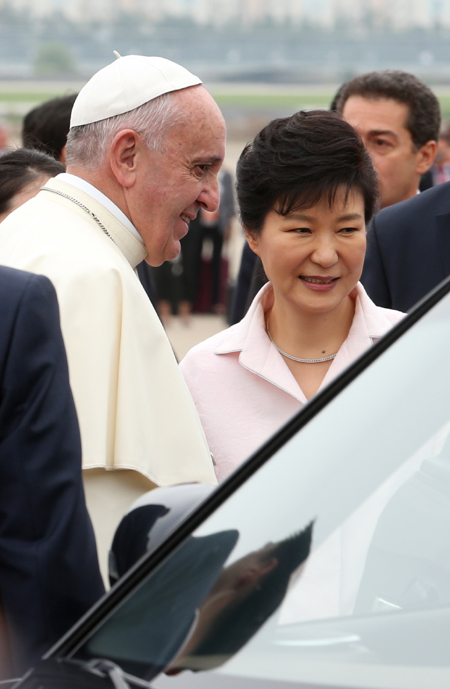 ▲프란치스코 교황이 14일 오전 경기도 성남 서울공항에 도착해 영접나온 박근혜 대통령과 악수하고 있다. 연합뉴스