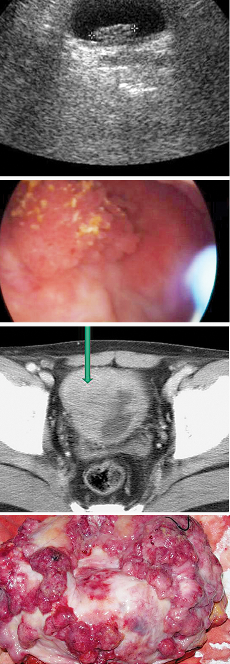 방광초음파검사에서 발견된 2.6㎝ 방광암, 방광내시경을 통해 나타난 방광암, CT검사에서 확인된 방광암, 방광 제거후 방광내의 암덩어리(사진 위부터). 사진=제주대학교병원 제공