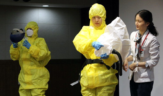 지난 5일 오후 서울 중구 을지로 국립중앙의료원에서 열린 에볼라 대응 관련 기자설명회에서 의료진이 에볼라 대응 개인보호장구 착용을 시연하고 있다. 연합뉴스