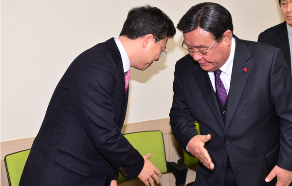 23일 제주도가 '도의원 20억 요구설'에 대해 "구성지 의장이 집무실로 불러 제안한 것"이라고 밝힌 가운데 이날 오후 한 행사장에서 구성지(왼쪽) 의장이 박정하 도 정무부지사의 악수 제안을 거부하며 불편한 심기를 드러내 보이고 있다. 강희만기자