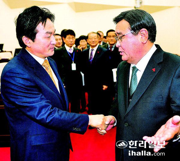 원희룡(왼쪽) 지사가 23일 도의회에서 최근 돌출발언과 관련 공식 사과했으나 구성지 의장은 여전히 불편한 심기를 보였다. 이날 원 지사와 구 의장이 어색한 악수를 나누고 있다. 강희만기자