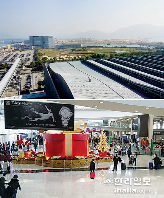 현재 연간 6000만명이 이용하고 있는 첵랍콕 홍콩국제공항. 전망대에서 바라본 공항인근 지역. 위쪽으로 홍콩과 마카오를 잇는 도로매립공사 현장이 선명하게 보인다.(사진 맨 위) 첵랍콕 국제공항 여객터미널 내부 모습. 이현숙기자