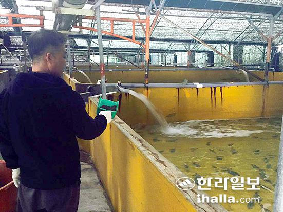 환경친화형 배합사료 시범사업에 참여한 서귀포시의 한 양식장에서 어린 넙치에게 어분 등을 재료로 만든 배합사료를 주고 있다. 송은범기자