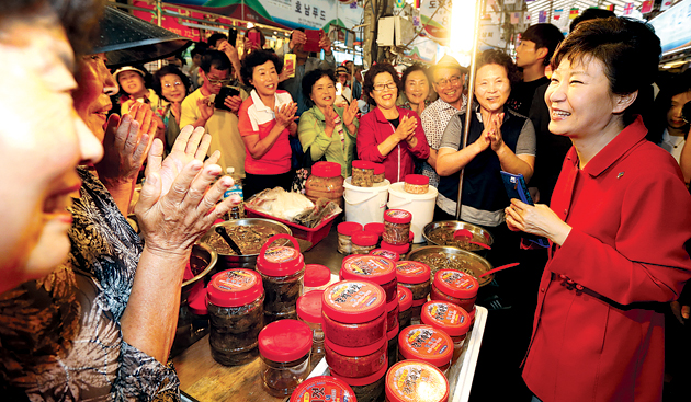 박근혜 대통령이 26일 제주시 동문시장을 방문, 시민과 인사하고 있다. 연합뉴스