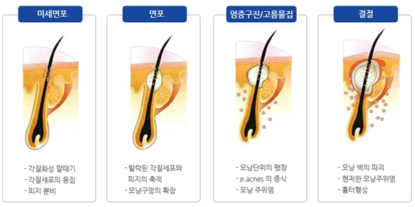 여드름은 비염증성과 염증성 병변으로 구분할 수 있는데, 면포는 비염증성 병변으로 털집 상피의 이상 각질화로 인해 각질과 피지가 정체돼 생성된 것을 말한다. 면포는 털집 입구의 상태에 따라 개방면포와 폐쇄면포로 나눌 수 있다. 폐쇄면포가 오래 지속되면 염증이 생기기 쉽다. 털집에 상주하던 P. acnes가 증식 및 지방분해 효소를 분비해 피지 성분중 중성지방을 분해하고, 여기서 생성된 유리 지방산이 털집을 자극한다. 더불어 털집 자체의 P. acnes에 대한 면역학적인 반응도 발생해 털집벽을 터트리고, 피지, 세균, 탈락된 세포들이 피부내로 방출돼 서로 엉겨서 염증성 병변인 홍반, 부종, 구진, 고름물집, 결절, 거짓낭 등 다양한 병변을 유발한다. 이에 따른 후유증으로 피부가 울퉁불퉁하게 튀어나오거나 패인 흉터가 생기기도 한다.
