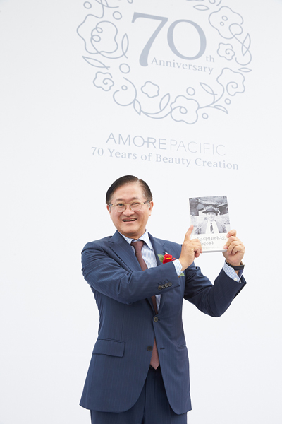 서경배 아모레퍼시픽그룹 회장이 지난 5일 열린 아모레퍼시픽 창립 70주년 기념식에서 최근 펴낸 서성환 창업주의 평전 '나는 다시 태어나도 화장품이다'를 들어보이고 있다. 사진=아모레퍼시픽 제공