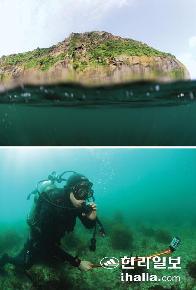 바닷속에서 올려다 본 성산일출봉(위). 바닷속 상황을 촬영중인 특별취재팀(아래).사진=특별취재팀