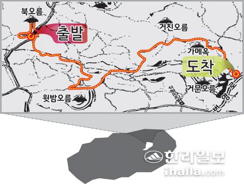 이른 아침 지친몸을 이끌고 출발해 6시간동안 걸어온 트레킹 일정이 파노라마처럼 스쳐 지나갔다. 신년 새벽 일출도 이만한 감흥을 주지 못했을 것이다. 비단 나만의 생각은 아니었으리라. 가메옥 정상에서 만난 잊지 못할 감흥을 추스리고 가메옥에서 내려온 일행들은 다시 목장길을 따라 20여분을 걸어 번영로로 나왔다. 이날 여정을 모두 마무리하고 번영로에 세워둔 버스에 오르자 성악가 김동규의 '10월의 어느 멋진날에'가 입가에 맴돌았다.