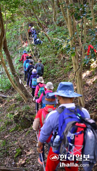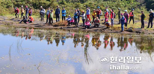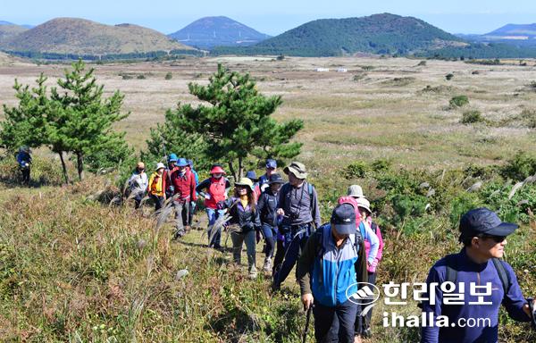 이번 에코투어 코스는 곶자왈의 식생에 감탄하고 눈에 띄는 산열매에 군침을 흘리며 몽골의 초원을 연상케하는 장관이 특징이다. 사진은 가메옥오름을 오르는 탐방객들. 강희만기자