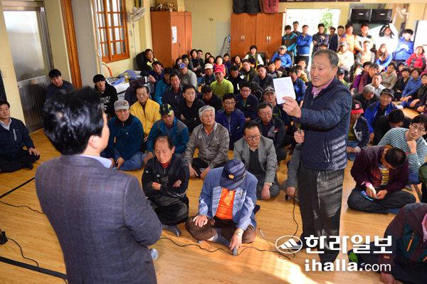 15일 오후 서귀포시 성산읍 신산리 노인회관에서 열린 제2공항 건설에 따른 주민간담회에서 한 주민이 원희룡 지사에게 제2공항 유치 반대 의견을 피력하고 있다. 강희만기자
