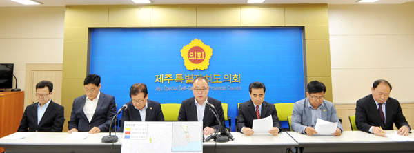 더불어민주당 제주도당이 8일 제주도의회 도민의방에서 기자회견을 열고 새누리당 강지용 국회의원후보의 재산신고 누락 의혹을 강하게 제기했다. 사진=제주도의회 제공
