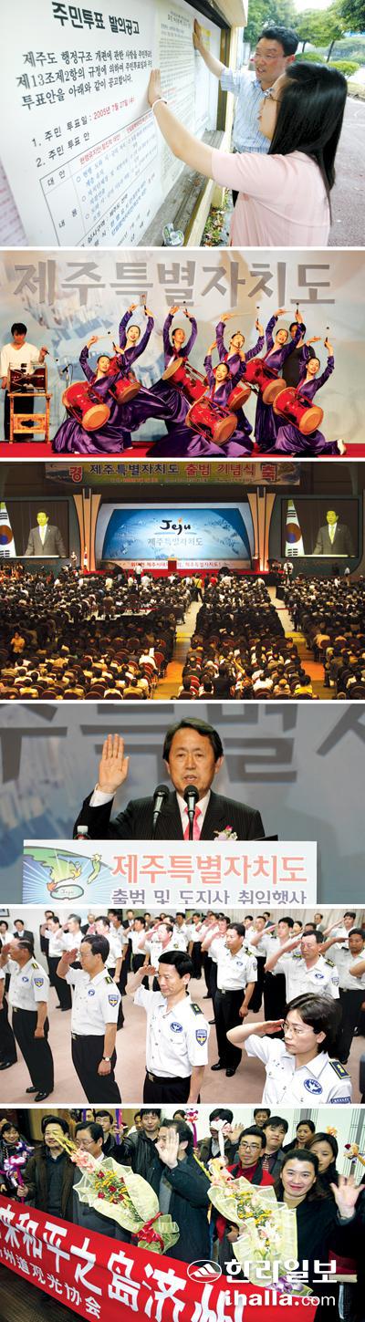 사진은 위부터 1. 제주특별자치도 출범에 앞서 행정구조 개편 주민투표발의 공고문을 부착하고 있다. 2 제주특별자치도 출범을 축하하는 무대공연 3 제주특별자치도 출범식 현장 4 제주특별자치도지사 취임 선서를 하고 있는 김태환 전 제주도지사 5 자치경찰단 임명식 6 최초로 무사증 입도한 중국인. 사진=한라일보DB