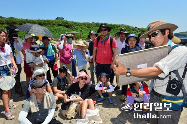 지난 13일 전문가 탐방 진행을 맡은 전용문 박사가 화산 분출에 얽힌 수월봉의 이야기를 풀어내고 있다. 강경민기자
